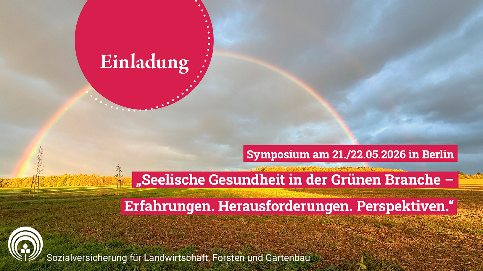 Vergrößerung des Bildes für Regenbogen über einem Feld, im Hintergrund ein Wald; über dem Foto der Einladungstext zum Symposium "Seelische Gesundheit in der Grünen Branche".